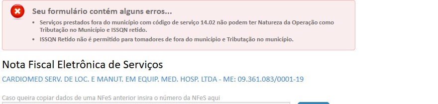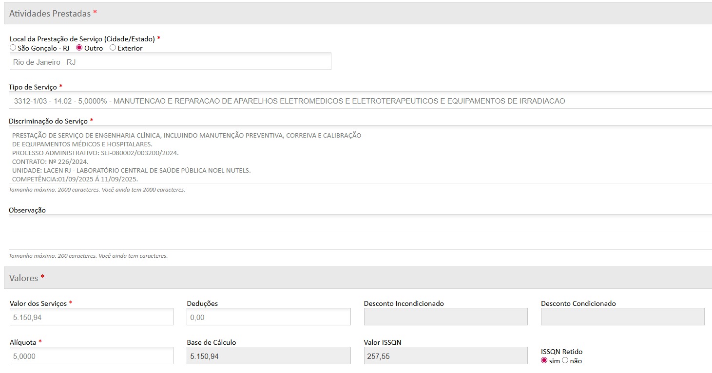 09361083000119 Bom dia! A empresa situada em Sao Goncalo esta prestando servicos no Rio de Janeiro, ou seja, fora do municipio de Sao goncalo, e ela como tomador esta retendo o ISS dessa prestação de Servicos. Quando informo ISSq retido esta aparecendo uma mensagem que nao deixa eu emitir a NF.